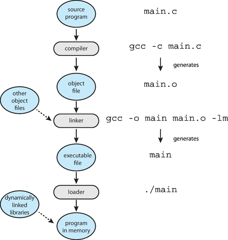 프로그래머가 main.c 코드를 작성한 후 컴파일을 진행하게 되면, 모든 물리적 메모리 위치에 로드되도록 설계된 relocatable object file이 생성됩니다. 이후, linker는 여러 relocatable object file과 library들을 포함시켜 하나의 single binary 형태인 executable file을 생성합니다.