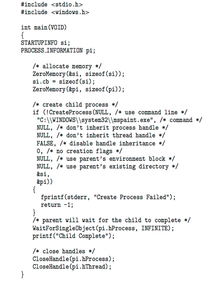 UNIX와 Windows는 자식 프로세스를 생성할 때 차이점이 존재합니다. UNIX에서 제공하는 fork()는 자식 프로세스가 부모 프로세스의 주소 공간을 물려받는 반면에, CreateProcess()는 프로세스 생성 시 지정된 프로그램을 자식 프로세스의 주소 공간으로 로드하도록 요구합니다.