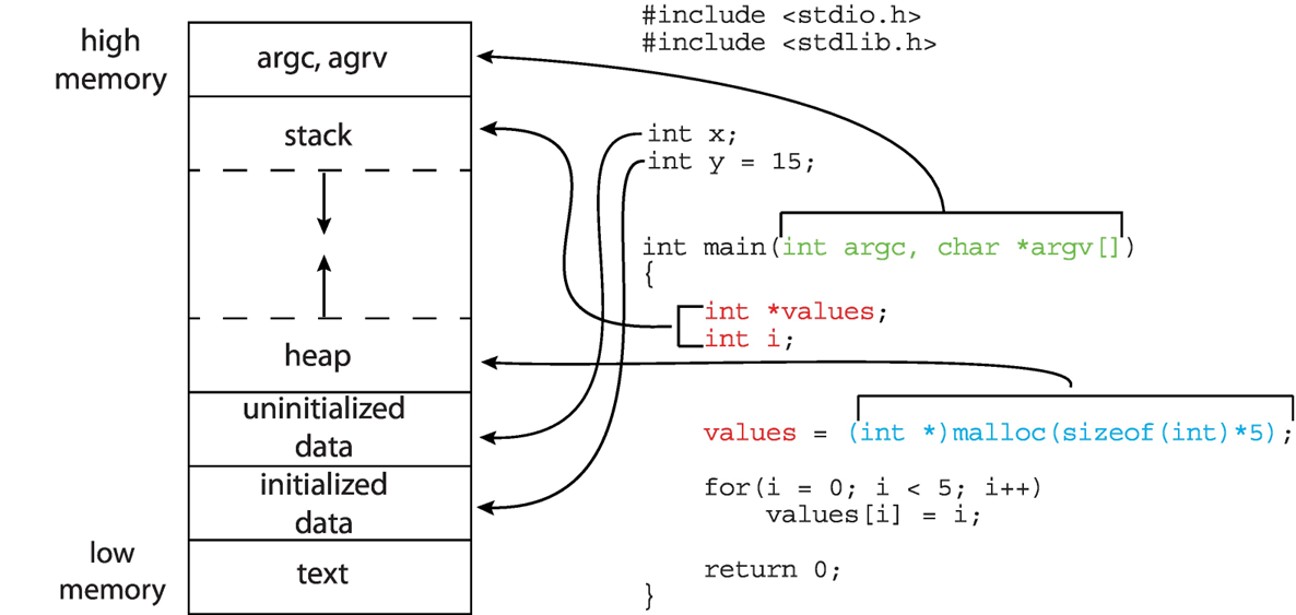 Stack Section의 경우, function parameters, local variables들과 return address 값들이 스택에 PUSH 되어 Stack이 늘어나고, 함수가 끝날 때 POP을 수행하면서 Stack이 줄어들게 됩니다. 또한, Heap Section의 경우, 동적으로 메모리를 할당하게 되면 Heap이 늘어나게 되고, 할당된 메모리를 반환하면 Heap이 줄어들게 됩니다.