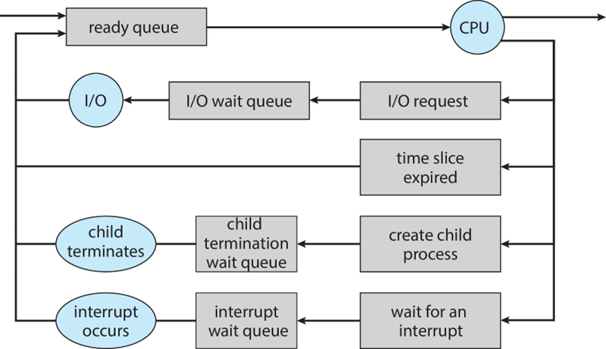 위 그림과 같이, I/O request, create child process 등 특정 이벤트가 발생할 경우, Ready queue로 다시 들어가게 됩니다. 이러한 과정을 프로세스가 종료될 때까지 계속해서 수행합니다. 이후, 프로세스가 종료될 때, 해당 프로세스는 모든 대기열에서 제거되고 PCB와 할당된 자원이 해제됩니다.