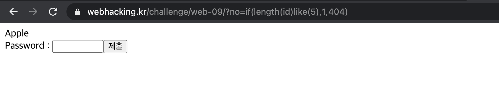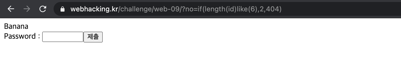 First, URL: https://webhacking.kr/challenge/web-09/?no=if(length(id)like(5),1,404)