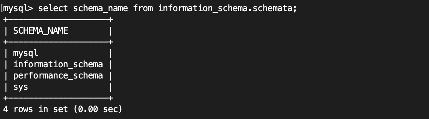mysql> select schema_name from information_schema.schemata; (= show databases;)