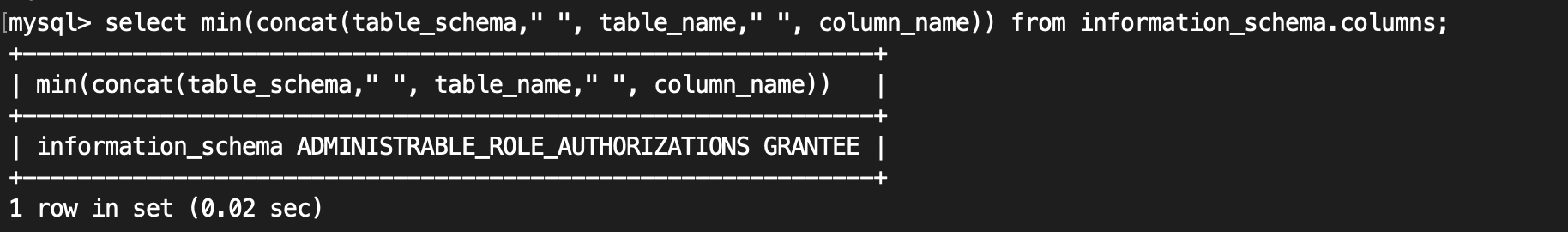 mysql> select min(concat(table_schema," ", table_name," ", column_name)) from information_schema.columns;
