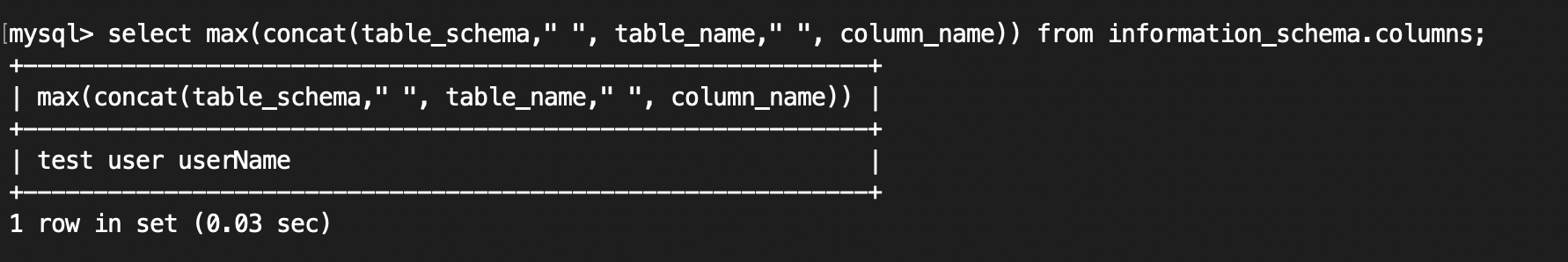 mysql> select max(concat(table_schema," ", table_name," ", column_name)) from information_schema.columns;