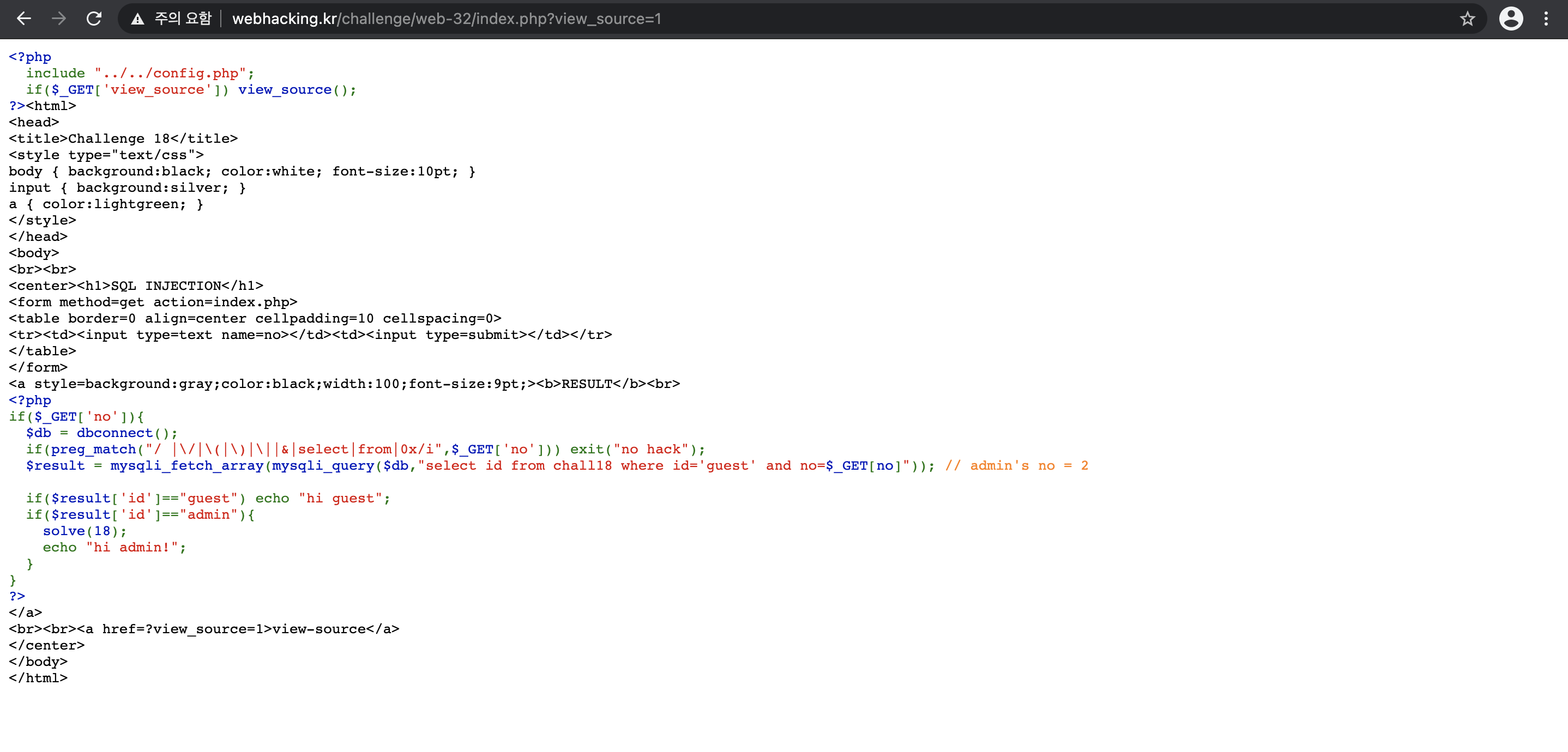 $result = mysqli_fetch_array(mysqli_query($db,"select id from chall18 where id='guest' and no=$_GET[no]")); // admin's no = 2