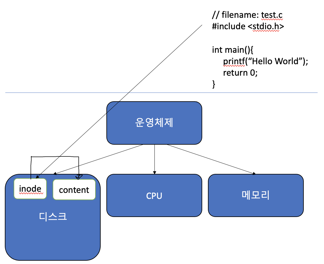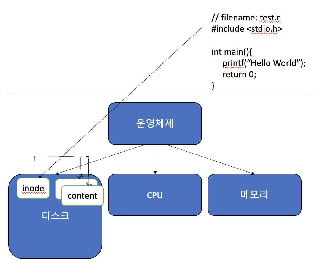 즉, 다시 말해 운영체제는 디스크에서 디스크 블록을 할당 받아 파일의 내용을 기록하고, inode를 할당받아 파일의 속성 정보를 기록한 후, 파일의 이름과 inode와 디스크 블록을 연결합니다.