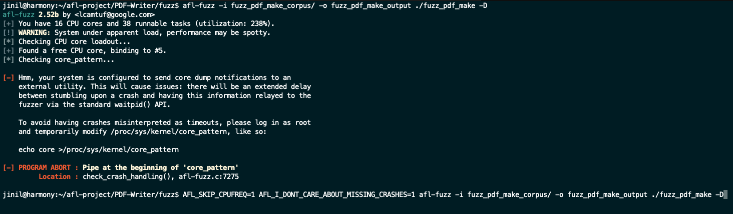 단, 이때 주의할 점은 input directory에 Seed 값을 가진 파일이 존재해야 하며, output directory는 존재하지 않는 이름으로 해주어야 합니다. 또한 아래와 같이 오류가 뜰 경우 아래 내용을 복사하여 afl-fuzz 앞에 붙여주시면 올바르게 동작합니다.