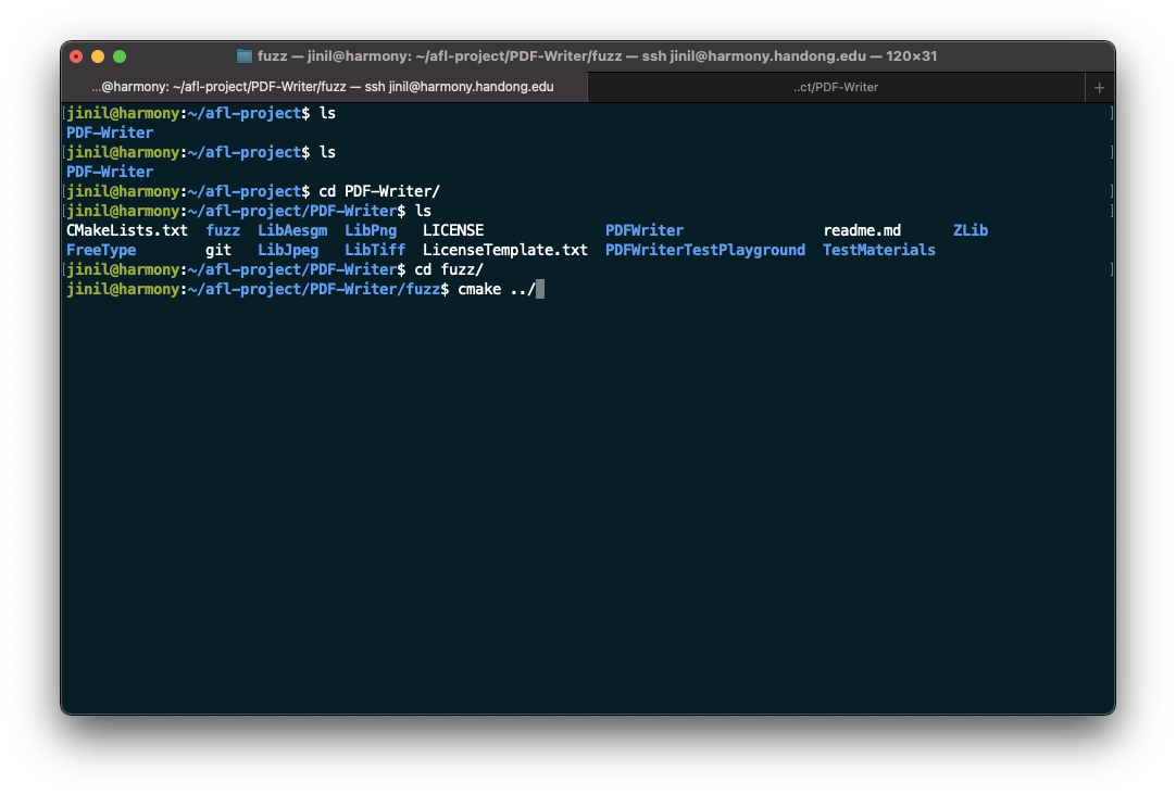 이제 본론으로 들어가서, CMakeLists.txt 파일이 있으니 cmake를 해주면 되는데, 아까 만든 fuzz 디렉터리로 이동한 후 아래 명령을 통해 빌드해줍니다.