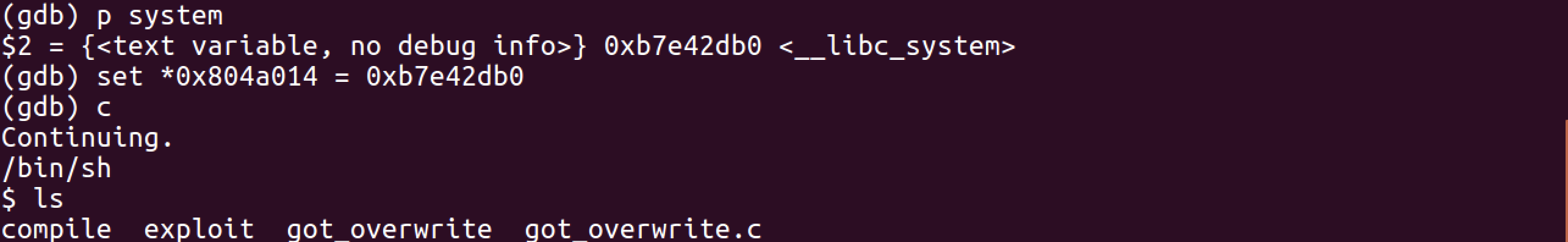 위에서 보았던 0x804a014 (puts 함수의 GOT)에 system 함수의 실제 주소로 덮어쓰면 어떻게 될까요?