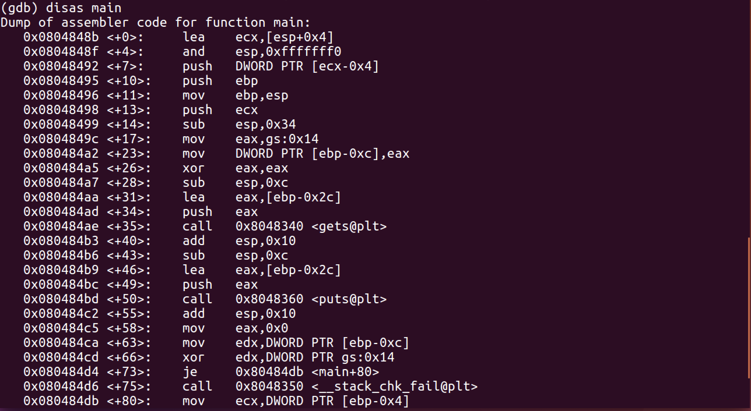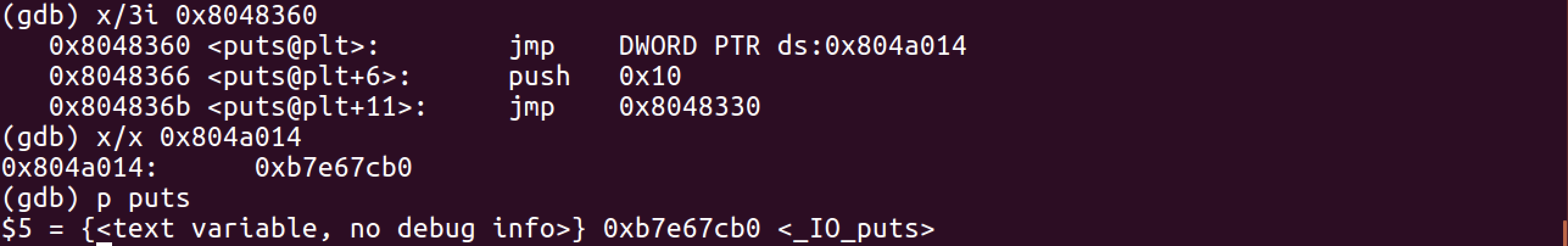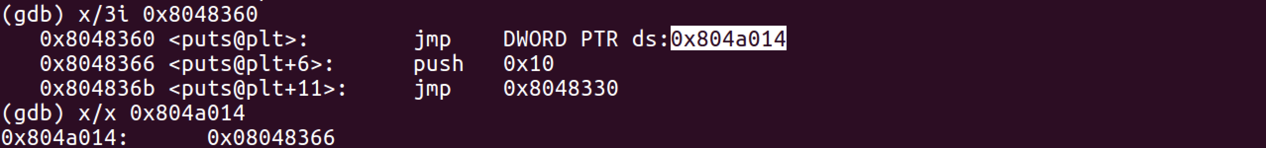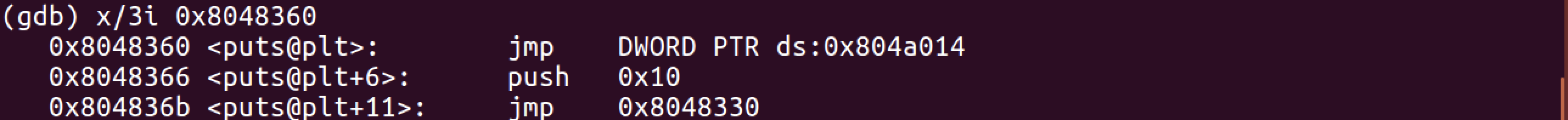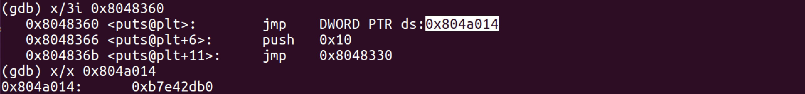 puts 함수의 PLT 주소를 보시면 jmp DWORD PTR ds:0x804a014 라고 되어있는 부분을 볼 수 있습니다. 이 부분(0x804a014 주소)이 puts 함수의 GOT 주소입니다.