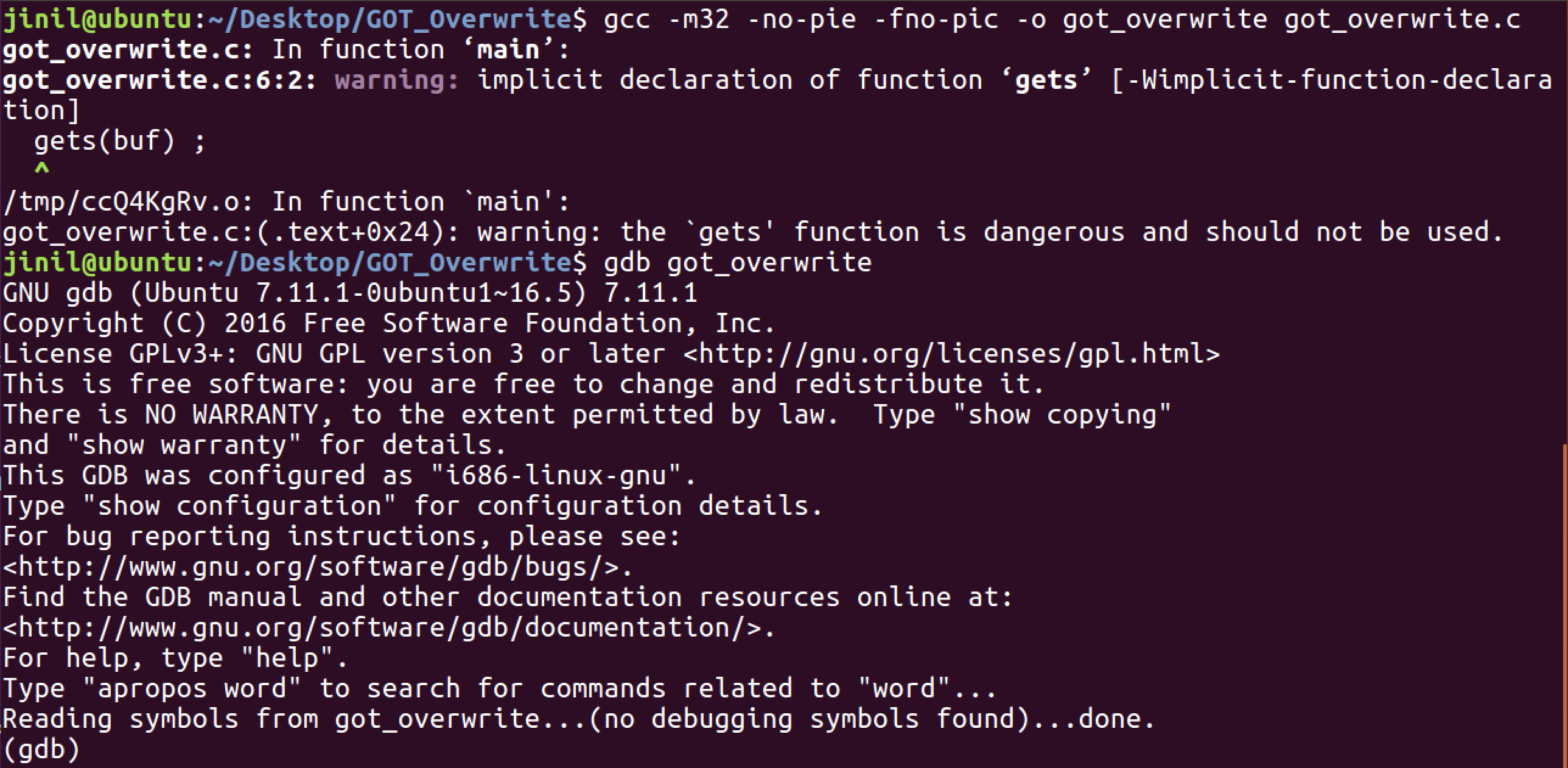 컴파일 과정을 거쳐 gdb를 실행시켜줍니다. 컴파일 과정에서 warning이 뜨는 것은 gets함수가 buffer overflow를 일으킬 수 있는 취약한 함수이기 때문입니다.