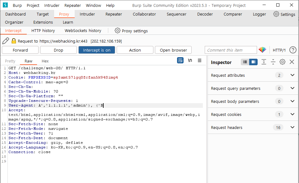 위 문제는 INSERT 쿼리를 조작하여 admin 계정을 생성하고, admin 계정을 생성할 때 등록한 USER_AGENT 값을 줘서 admin 계정으로 로그인하면 됩니다.
